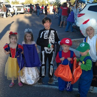 We did some trunk-or-treating at our church last week and my crew was mostly dressed in Mario Bros. fashion. Leila was Snow White, Matthew was a skeleton with a couple of broken bones, Sarah was Princess Peach, Joshua was Toad, and Nathan & Ryan were Mario & Luigi.